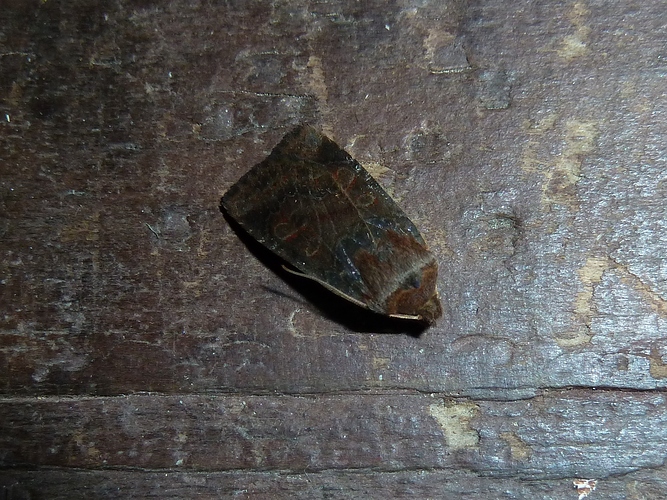 Aikoihin ei ole yökköstä kuistilla näkynyt mutta tämän löysin lattialautojen välistä ja kaivoin esiin. Kovin tummalta näytti. Onko kuitenkin “vain” puolukkapiiloyökkönen (Conistra vaccinii)? Samoja kuvioita mielestäni löytyy mutta väri on jotenkin outo?