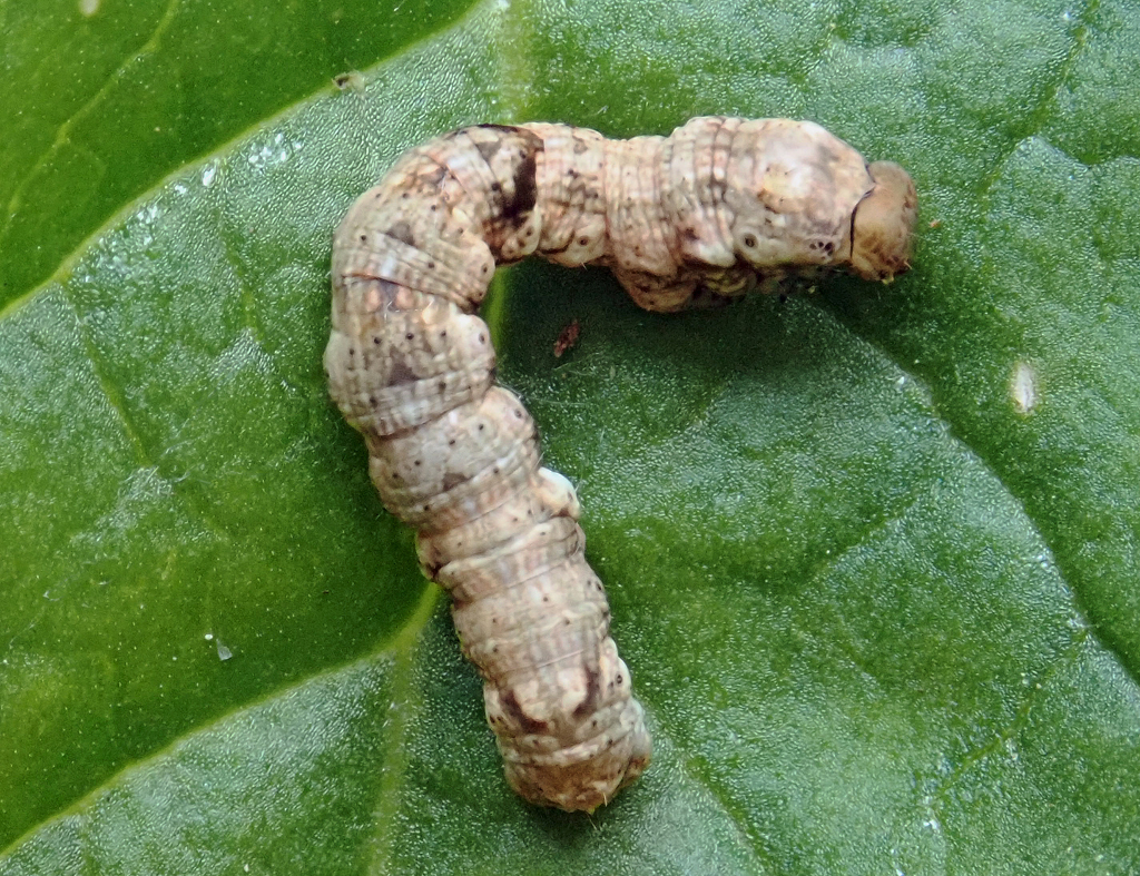 Voisi olla Ectropis crepuscularia. (Kuvasin taannoin em. lajin pienemmän toukan. En näitä ole määritellyt paljon mutta googlauksen perusteella uskallan arvata; kovin on samaa näköä, lähinnä joku toinen saman suvun laji voisi sotkea.)