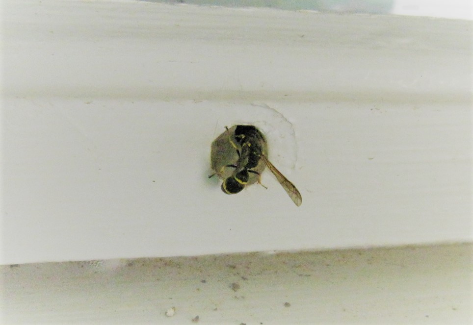 Hietahukat nimensä mukaisesti pesivät hiekassa maan kamaralla. Tämä on joko koloampiainen tai sorjoampiainen. Google antaa lisää tietoa ja kuvia mihin voit verrata tätä. Nämä erakkoampiaiset ovat juurikin rakennuksissa kolopesijöitä ja pesä tehdään savesta ja muurataan umpeen kun saalistus on päättynyt.