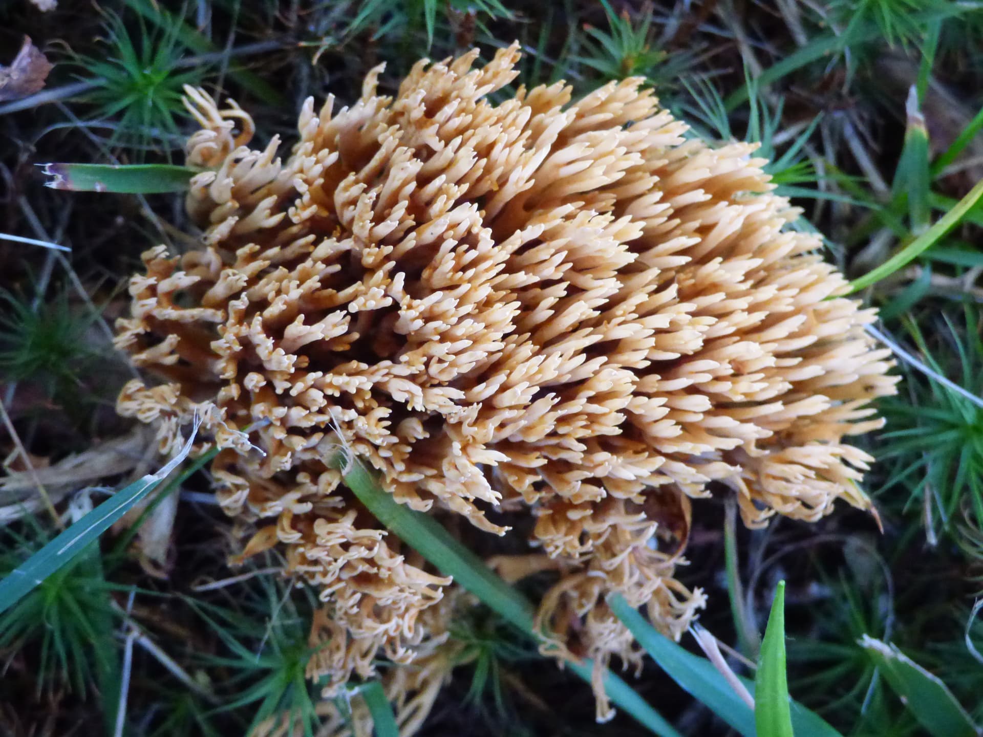 Sieni 2. Kuvattuna nurmikolla kuusen juurella 12.9.2025 sivulta. Sieneksi oletan, vaikka on monihaarainen. Voi toki olla useampikin sieni samassa rykelmässä. Tässä kuvassa sienet ovat tuoreita eli vastikään pintaan nousseita. Sieni tuntui aika kovalta liki puumaiselta.