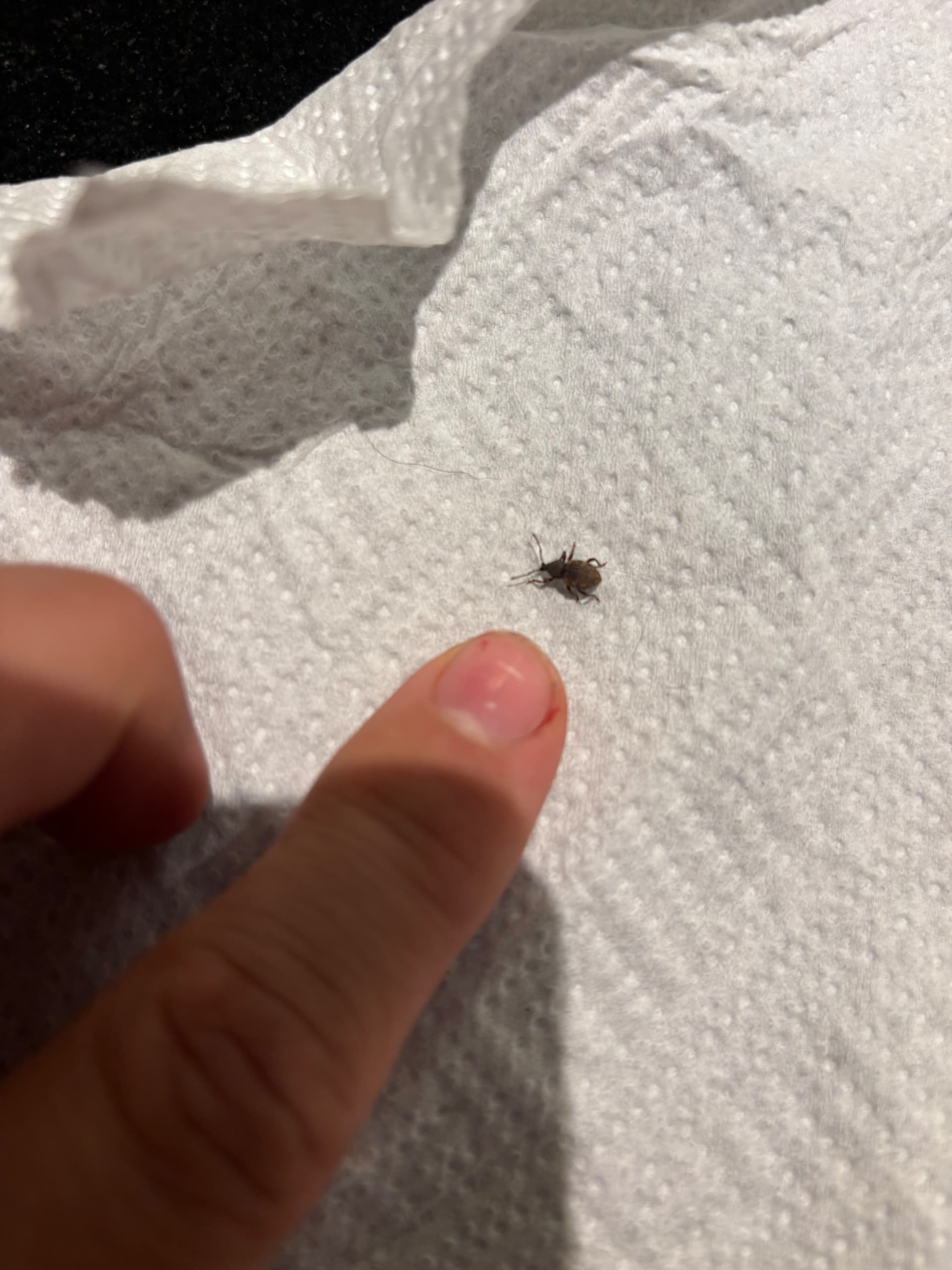 Ulkomuodoltaan tämä kovakuoriainen näyttää mielestäni kärsäkkäältä. Tällaisia ruskeita lajeja on useita, eikä näiden kuvien perusteella ole helppo määritellä tarkemmin lajia. Odotellaan, jospa joku asiantuntija uskaltaisi sanoa asiasta enemmän. Joka tapauksessa sisätiloihin eksynyt vaaraton hyönteinen.