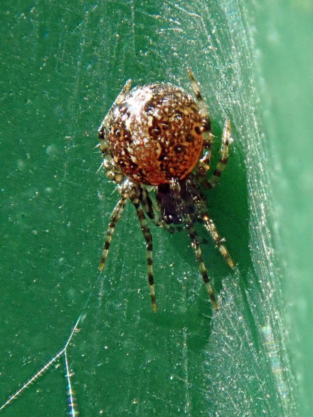 Koko oli max. 3mm. Yritin saada tarkan, hyvän kuvan ja otin niitä kymmenittäin eri valaistusolosuhteissa. Huonoin tuloksin. Saisikohan näistä kahdesta yhteensä mitään tolkkua? Kyse on samasta yksilöstä. Raajojen perusteella tutkin ristikkejä, mutta minkään kuviot eivät täsmänneet. Ei kai se sentään Araneus marmoreus ole?