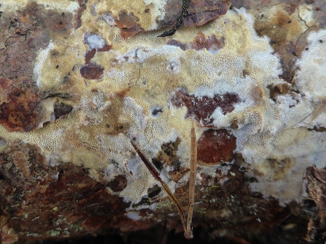 Kuvan kääpä kasvoi 15.7.2017 sammaleessa lojuvalla männyn oksalla. Tällaisia resupinaattisia on kyllä paljonkin, mutta tämä on tietyllä lailla omanlainen, aika keltasävyinen. Kuivanäyte (tallessa) on vielä ruskehtavasävyisempi. Paikka oli Kuusamon Valtavaara. Niemelän kääpäkirjan perusteella vahvimmalta ehdokkaalta tuntuisi kermakarakääpä (Junghuhnia luteoalba, ilmeisesti nykyisin Butyrea luteoalba). Mitä mieltä olette te jotka tämän lajin tunnette, sopiiko siihen vai tuleeko mieleen parempia ehdotuksia?
