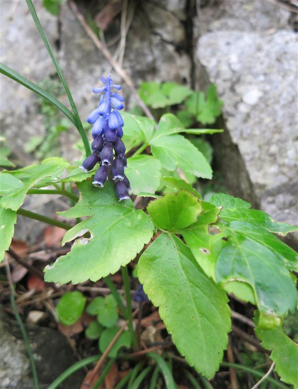 Vastaankin itse ensimmäisenä omaan kysymykseeni. Kävin vasta nyt keskustelun viherpeukalo- vaimoni kanssa tästä kasvista , ja hänen vahva näkemyksensä ja muistikuvansa oli se, että kyseessä on puutarhoistakin tuttu helmililja eli helmihyasintti.(Muscari armeniacum). Tuossa kuvassa on ilmeisesti jokin toinen kasvi hämäämässä rehevine lehtineen ja tuolle helmililjalle kuuluvat nuo kapeat lehdet. Nettitietojen mukaan M. armeniacum esiintyisi luonnonvaraisesti vain Kreikassa ja Aasiassa, joten siltä pohjalta tämä jäisi ehkä sukutasolle Muscari sp. Hyväksyttekö tällaisen näkemyksen ja lopputulospäätelmäni?